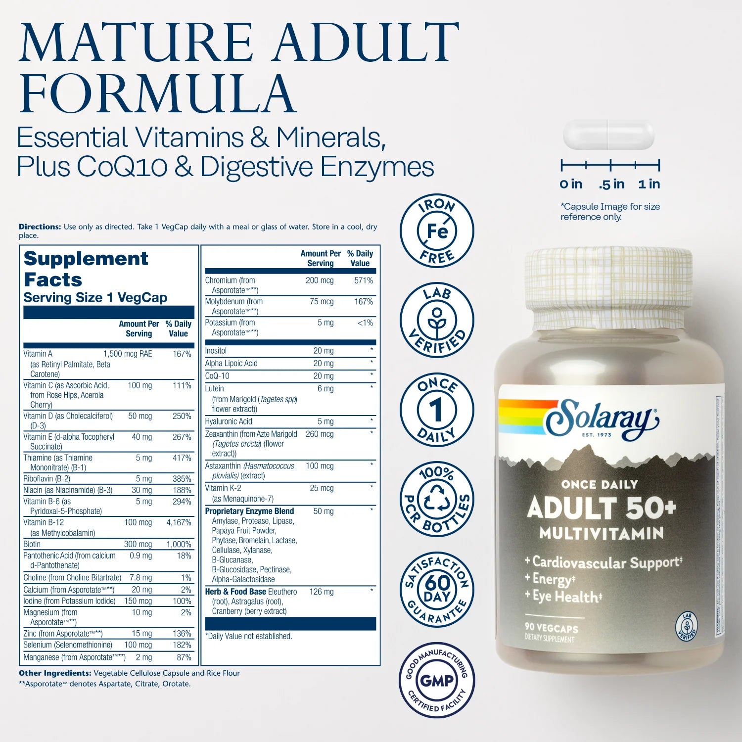 Como todos los productos Solaray, Once Daily Adult 50+ Multivitamin es rigurosamente probado y verificado en laboratorio para potencia y pureza.