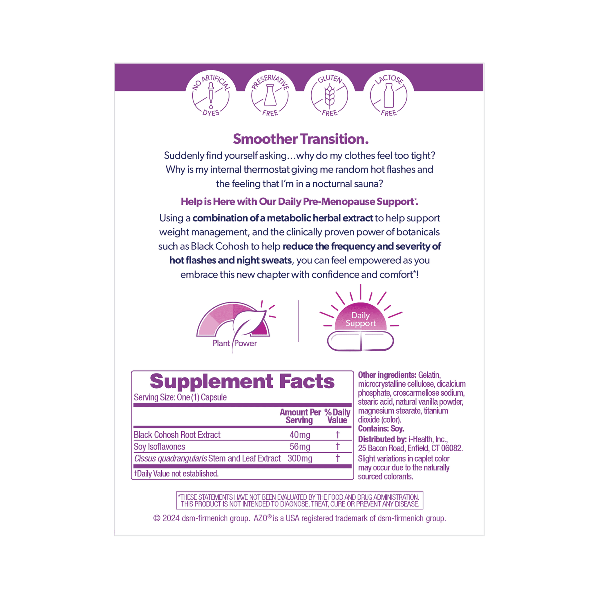 SEGURO Y LIBRE DE HORMONA: AZO Daily Pre-Menopause Support está libre de medicamentos, estrógenos y está hecho con ingredientes respaldados por la ciencia para apoyar la transición natural de su cuerpo.