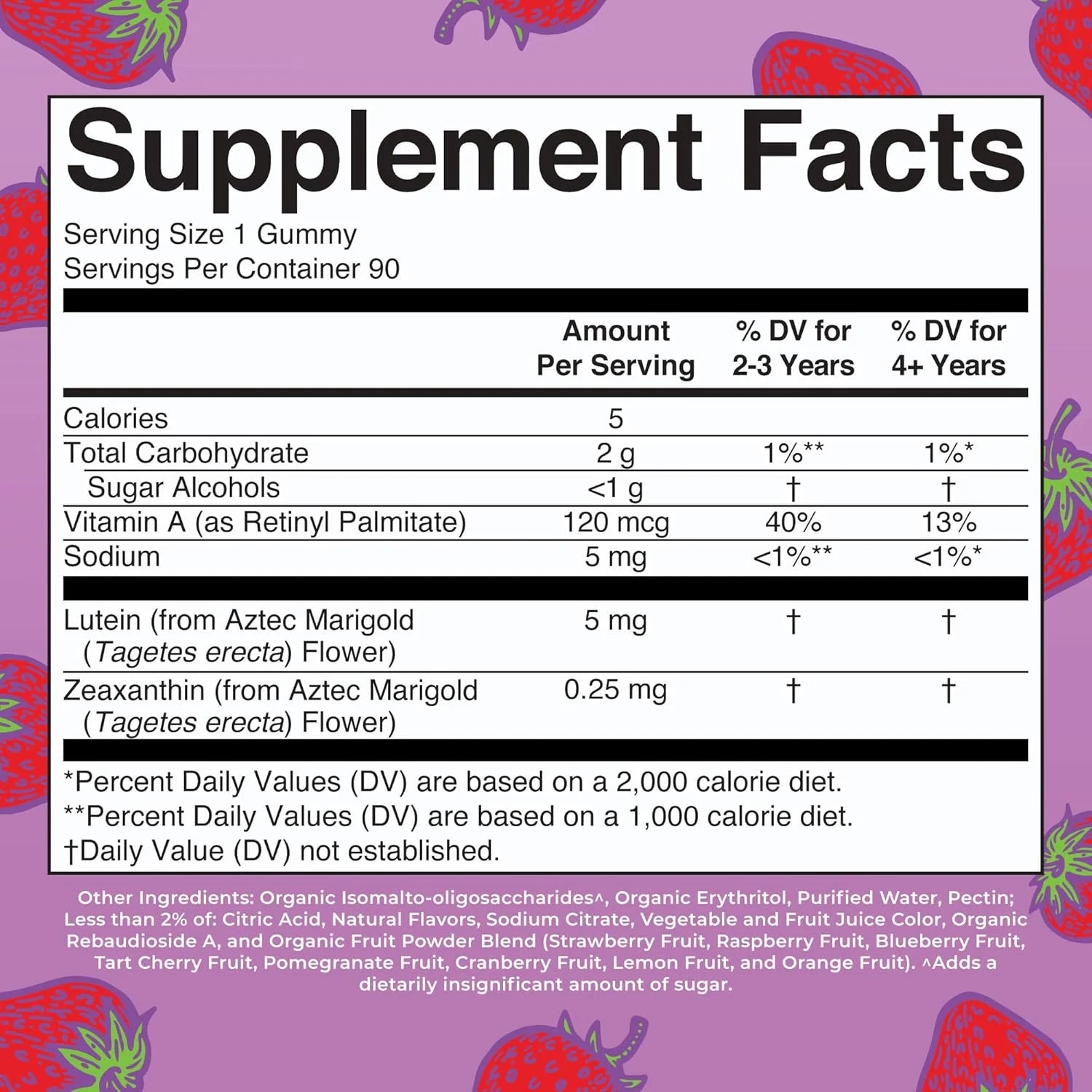 - Salud ocular: De los 600 carotenoides que se encuentran en la naturaleza, solo estos dos se depositan en grandes cantidades en la retina y la mácula del ojo. Estas gomitas también contienen vitamina A que apoya el cuidado de los ojos y proporciona apoyo para la visión, así como mantiene la salud de la piel, la inmunidad y la salud en general.
