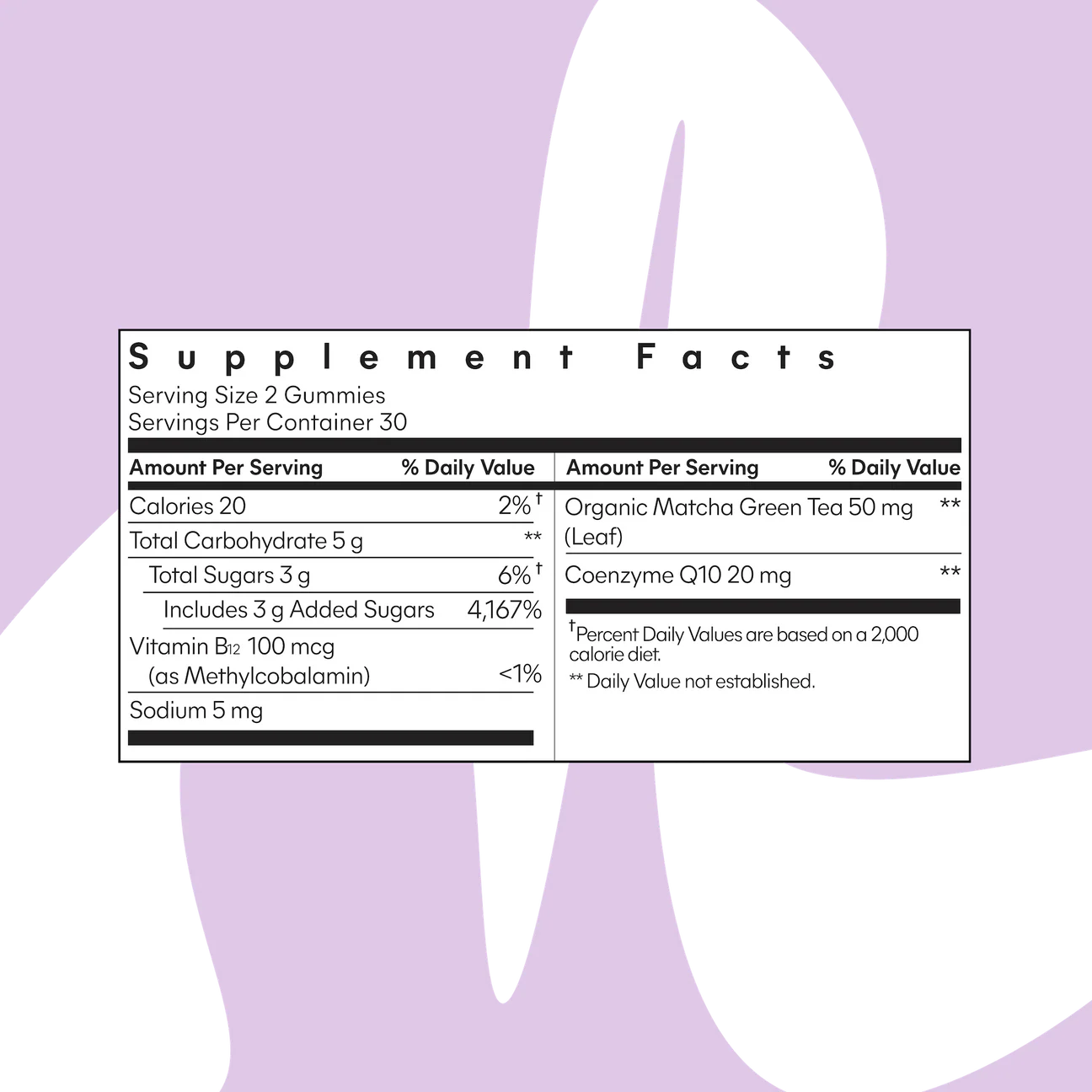 - Las gominolas Lemme Matcha Energy B12 están formuladas por expertos con Té Verde Matcha Ecológico, Vitamina B12 y CoQ10 antioxidante para apoyar la producción de energía, la energía celular y el bienestar general. Formuladas con B12 metilada, la forma más activa de B12, y con Matcha orgánico, un superalimento con increíbles propiedades clorofílicas, antioxidantes y teaninas. Las gominolas Lemme Matcha tienen un delicioso sabor a «matcha latte cremoso» para el apoyo diario de la energía celular.