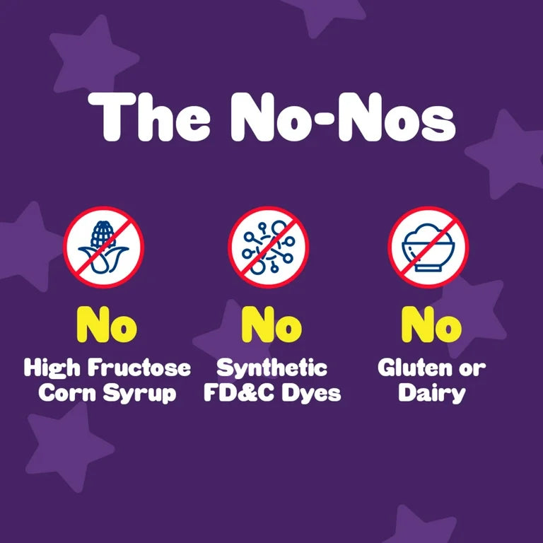 - Las gomitas de melatonina no contienen edulcorantes artificiales, gluten, jarabe de maíz de alta fructosa, lácteos ni colorantes sintéticos FD&C.