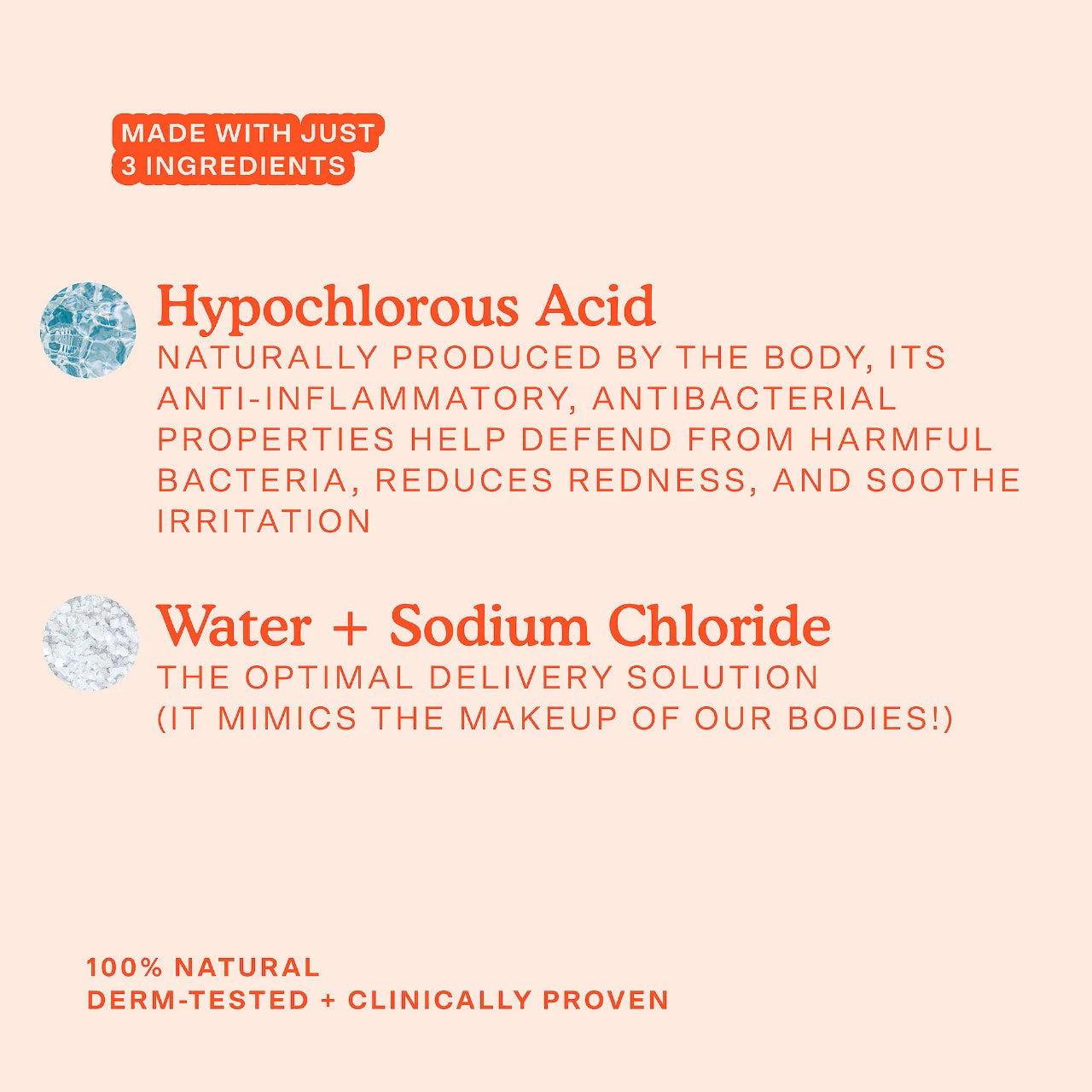 - Ácido hipocloroso: producido naturalmente por el sistema inmunológico del cuerpo, sus propiedades antiinflamatorias y antibacterianas ayudan a defender la piel de bacterias dañinas, reducen el enrojecimiento y calman la irritación.