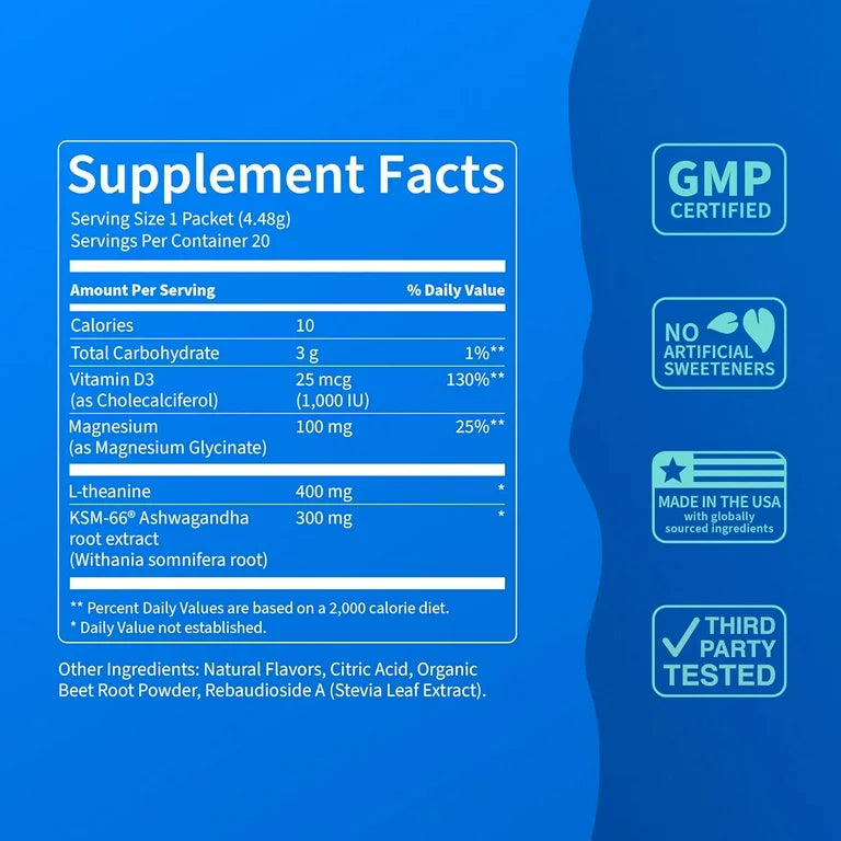 MEJORE SU EXPERIENCIA DE SUEÑO: Dé la bienvenida al sueño rejuvenecedor que su cuerpo anhela. Nuestro sabor a limonada de frambuesa ofrece algo más que sabor: contiene ingredientes como KSM-66 Ashwagandha, L Teanina y Glicinato de Magnesio Quelado, cada uno seleccionado por su asociación con la mejora de los patrones de sueño. Disfrute del potencial para un inicio más rápido del sueño, un sueño sostenido, un descanso más profundo y un despertar revitalizado.