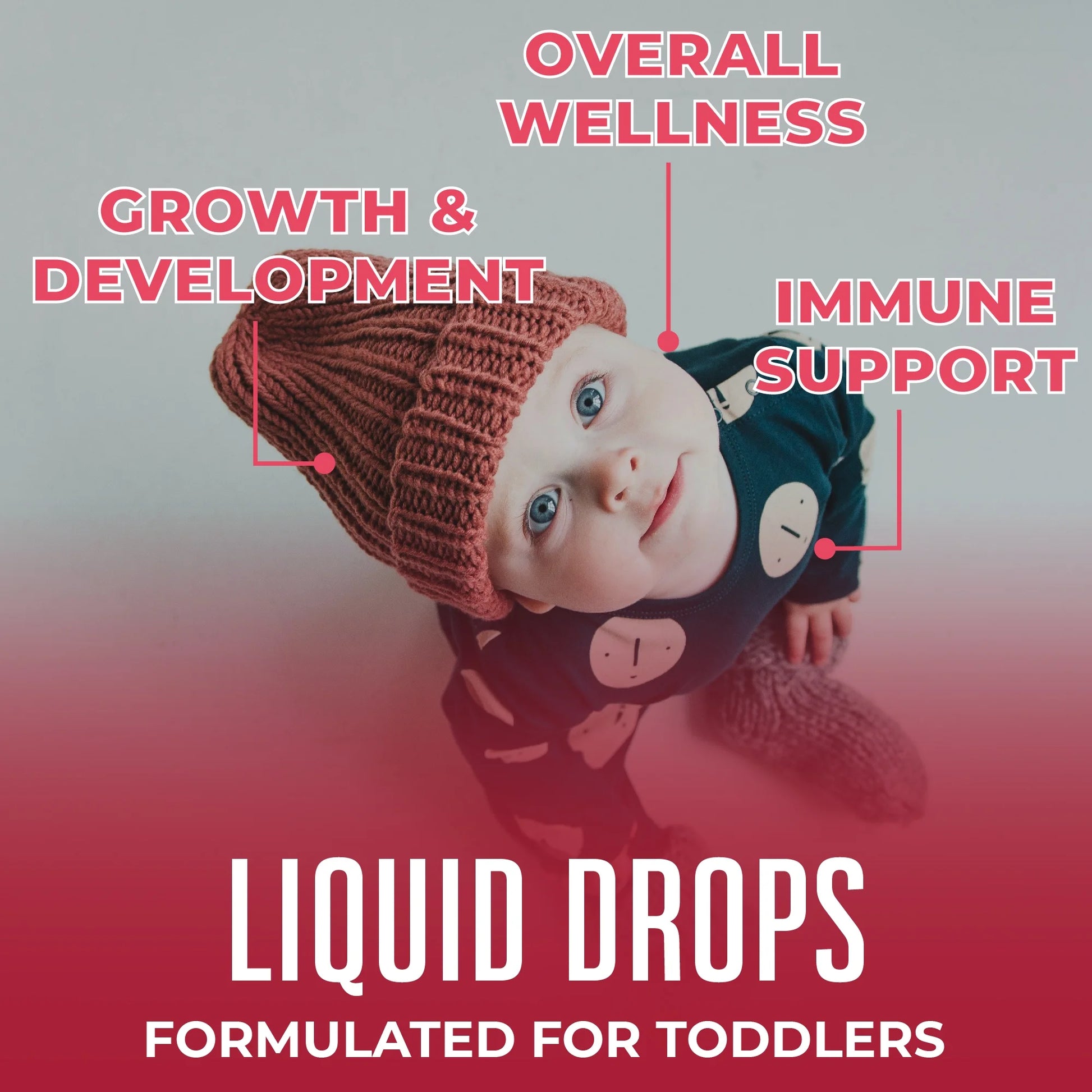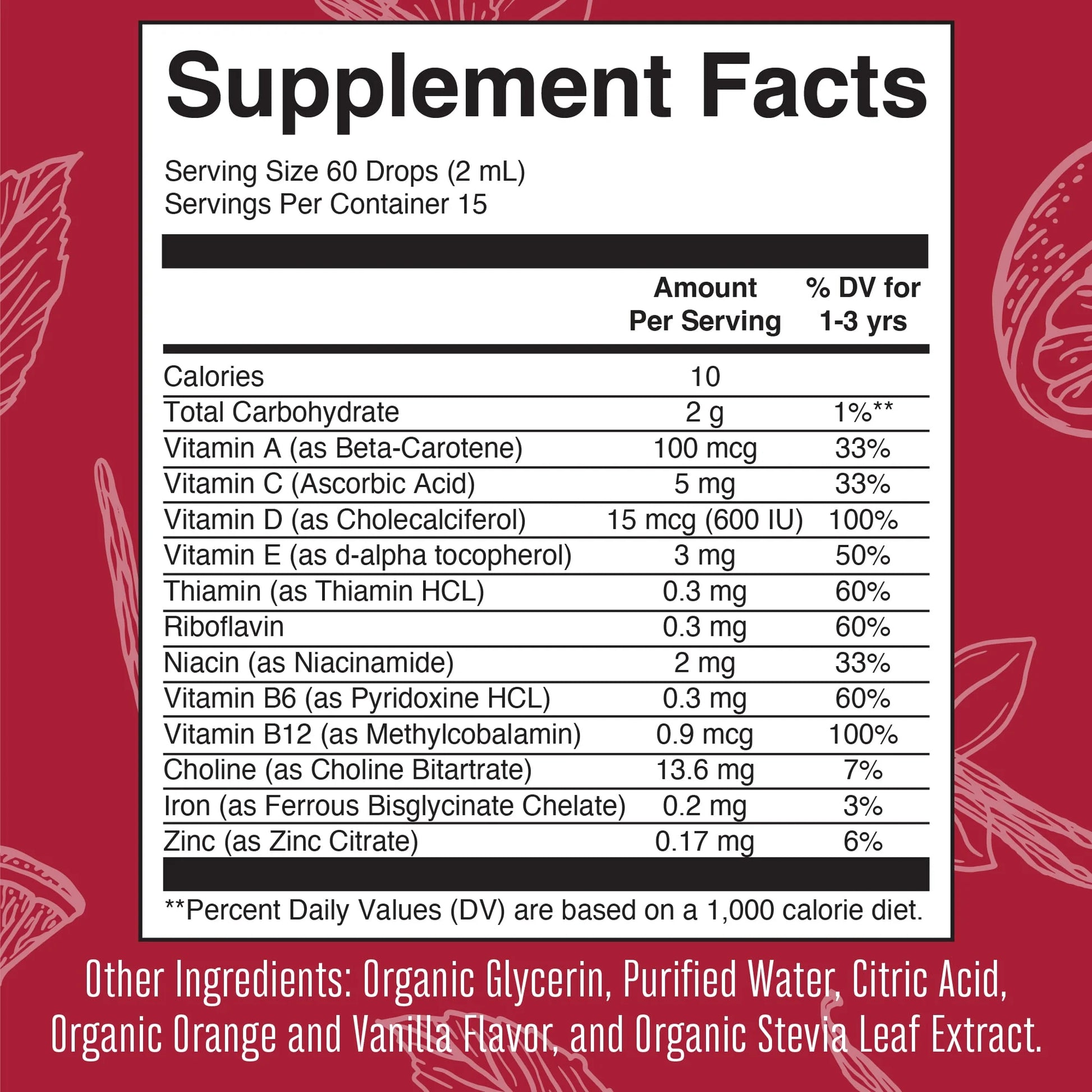 - Multivitamínico orgánico para niños pequeños con hierro: apoya el crecimiento y más con estas gotas líquidas. Repleto de nutrientes esenciales para tu hijo, como vitaminas A, C, B, D, E, hierro y zinc, todo en un delicioso sabor a naranja y vainilla.